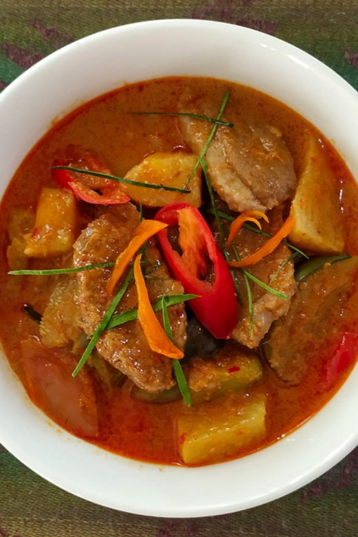 Indulge in the rich elegance of Thai Red Curry Duck (Gaeng Phed Ped), a beloved classic bursting with depth and aroma. Tender …